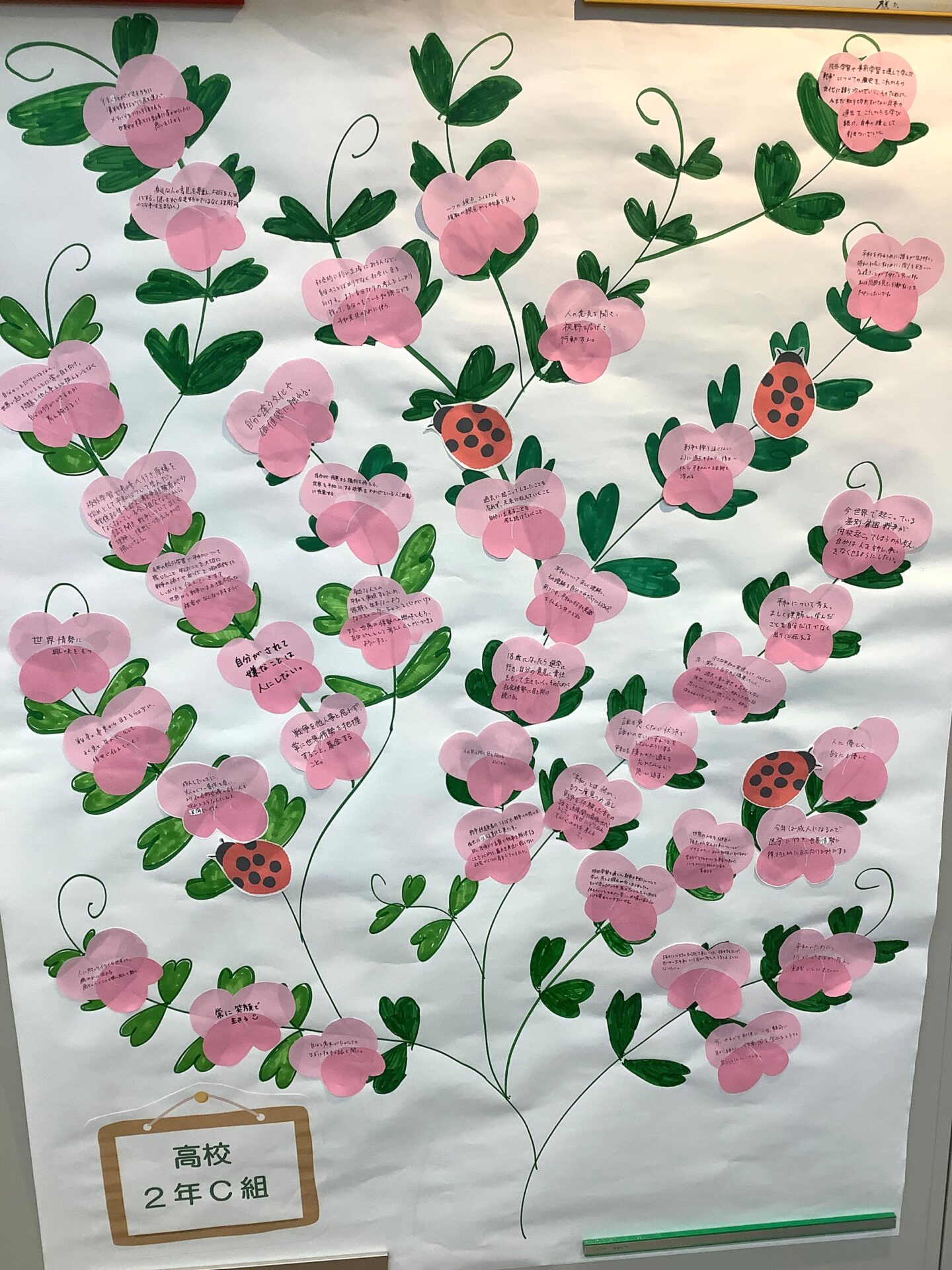 各自の思いを書いた花々には、「視野を広げて行動する」「自分と違う価値観にふれる」「平和とは何かもう一度見つめ直す」「常に笑顔で」「大人としての責任をもち、より社会的立場の弱い人を守るような人になる」など、たくさんの小さな願いと決意が書かれました。今の思いを忘れずに、ぜひ大きく未来に向かってほしいです。