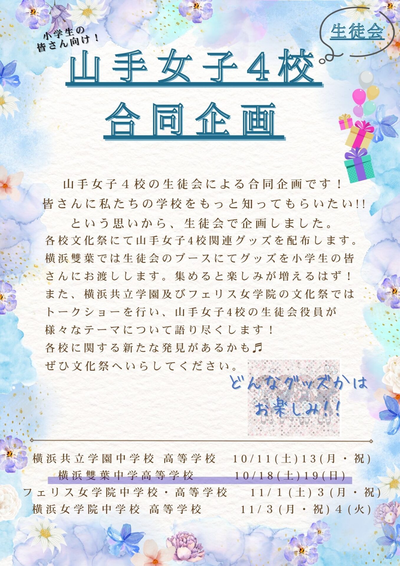 今年度の文化祭でも、山手女子4校の生徒会による合同企画を行うことになりました。生徒がデザインしたグッズを、各校の文化祭で小学生のみなさんにお渡しします。本校では、生徒会のブースにいらしてください。どのようなグッズかは、来てくださってからのお楽しみです。