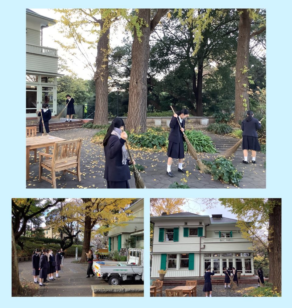 クリスマスに向け、自分たちの力を誰かのために使おうというテーマで、中3のあるクラスでは通学路として使っている元町公園の落ち葉掃きを行うことにしました。