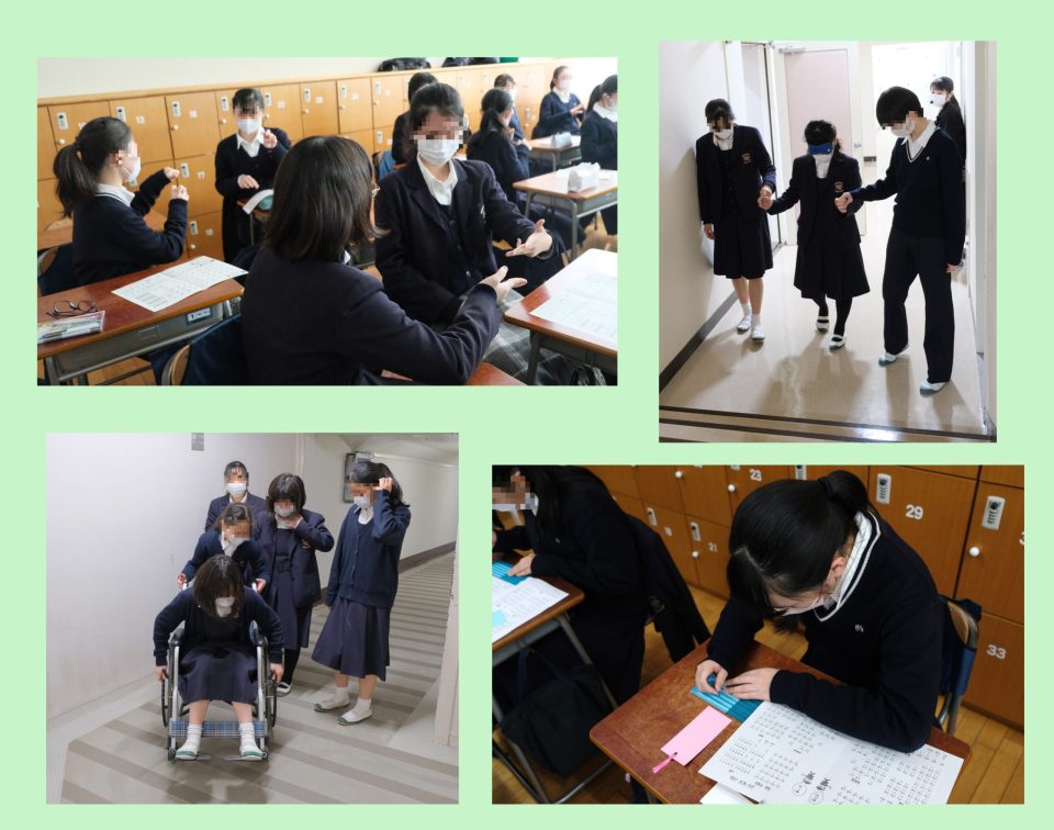 (左上)手話、(右上)ブラインドウォーク、(左下)車いす体験、(右下)点字