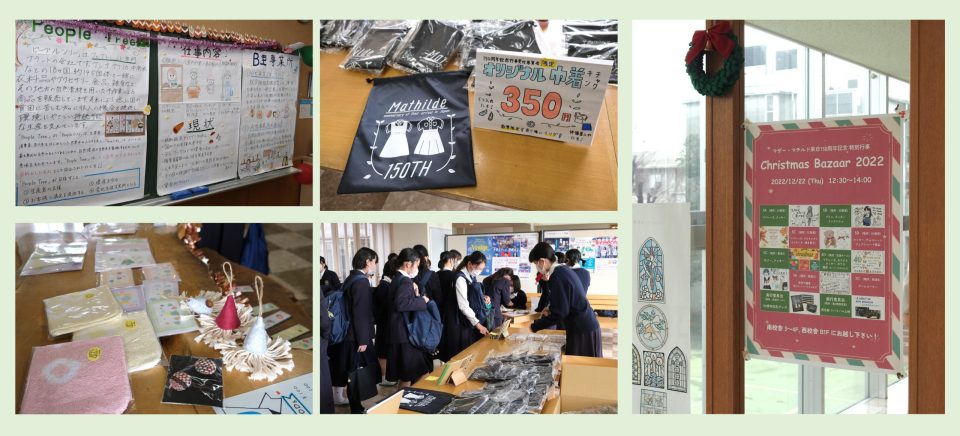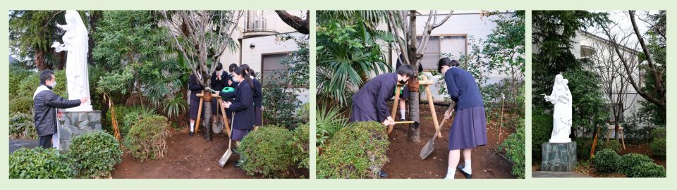 また放課後にはバザーが行われ、記念のペンやポーチなども販売されました。そして、校門のマリア像横に桜の木の植樹を行い、マザー・マチルドの来日150周年記念の一年間の行事が終了しました。