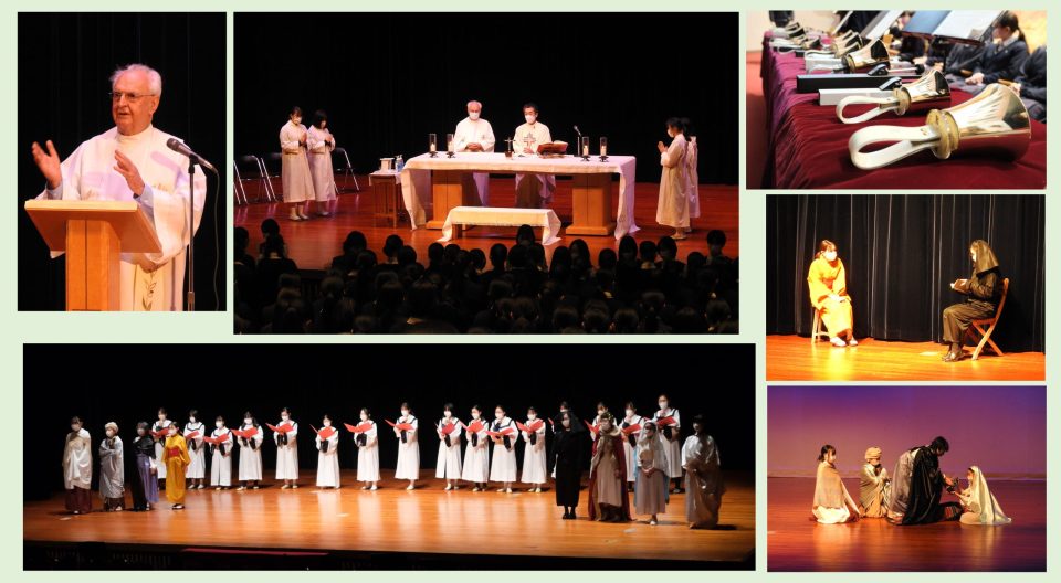 今年2月のマザー・マチルドの生誕日から始まった来日150周年を記念する行事もフィナーレを迎えました。クリスマスミサでは、マザー・マチルドの遠縁でいらっしゃるペラール神父様にお越しいただき、皆で喜びと感謝の祈りを捧げました。ミサの前には「150年前、来日して最初のクリスマス」という設定で演劇部と聖歌隊による聖劇も行われました。