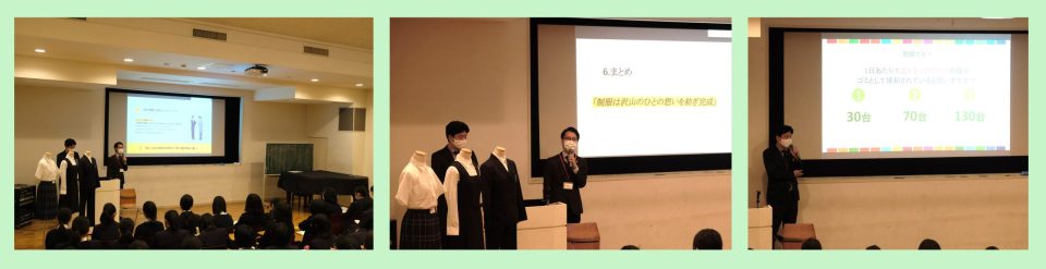 私たちの制服がどのように作られているのか、制服とはどういう意味を持っているのかということについてお話していただきました。毎日何気なく着用している制服ですが、多くの方の手を通して私たちの手元にきて、着ることができているのだと実感しました。また、大切に制服を着ることがSDGsにもつながることを学びました。
