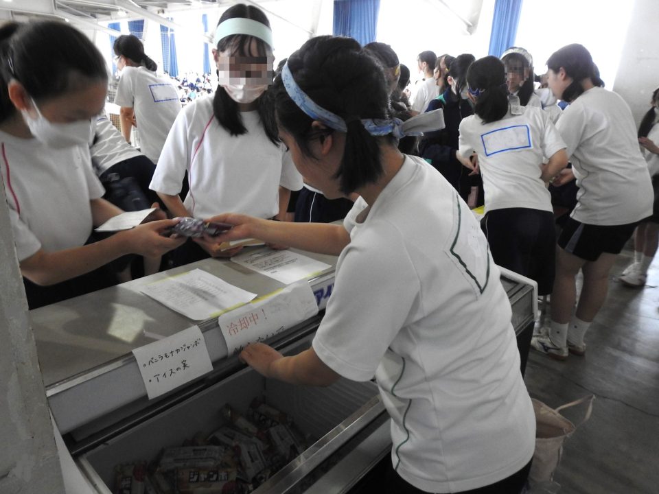 コロナ禍以前に行われていた、球技大会でのアイス販売を今年、再開しました。生徒会を中心に、各クラスの会計委員が集金・集計し、当日は各クラスから当番制で売り子を務め、無事に販売することができました。球技大会の活気ある応援とともに、アイスを嬉しそうに頬張る姿が大勢見られました。