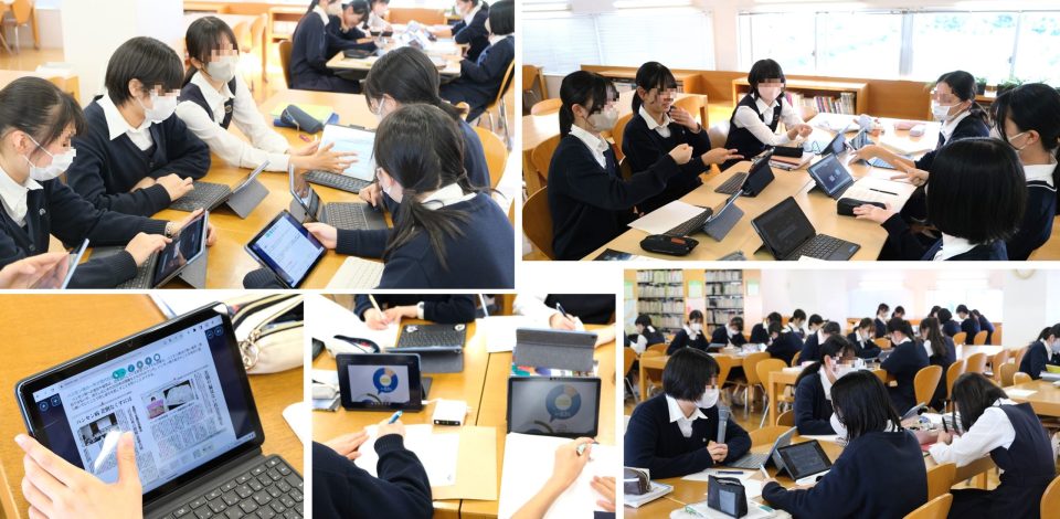 グループごとに各自で調査したレポートや資料を共有し、話し合いながら発表に向けて一つにまとめていきます。発表は各々のタブレットにスライドを共有して行い、聞き手の生徒たちは示されたグラフや新聞記事などを見ながら、真剣にメモを取っていました。