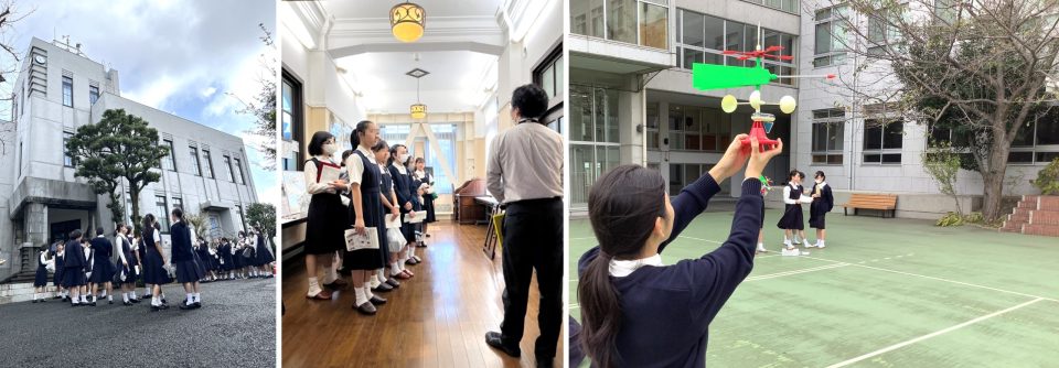 中1が理科の気象についての授業で、風向風速計などの機器を使って風力や湿度をはかったり、雲量を調べたりして気象の観測をしました。写真の授業の日は折しも朝から風が吹く日で、風速計の風杯がよく回って実験には最適の気候だったようです。