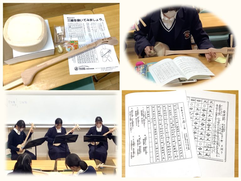 11月、高1の選択音楽で「三線」の授業を行いました。「三線キット」で自分の三線を組み立て、独自の楽譜である「工工四(クンクンシー)」を見ながら、「歌三線」の演奏にチャレンジしました。授業のまとめとして『てぃんさぐぬ花』『安里屋ユンタ』『安波節』を発表し合い、かつて「琉球」と呼ばれた沖縄独特の音色を味わい、歴史に想いを馳せました。
