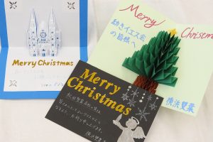 高校3年生はクリスマスに向けて、今年の夏、大雨で被災した秋田県のカトリック校やウクライナの子どもたちを支援する募金活動を行いました。また有志でクリスマスカードを作り、横浜雙葉ゆかりのシスター方などに送りました。