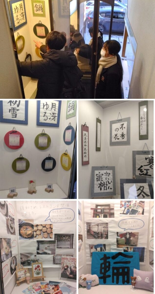 写真部、美術部に続いて、今週から元町商店街のポーラ・ステップ・ミュージアムに飾られたのは、書道部と家庭部の生徒の作品。さまざまな書体がさまざまな形で並んだ書の作品は見ているだけで心が落ち着くよう。家庭部は手芸などだけでなく、調理したクッキーなどの写真も並び楽しさにあふれています。