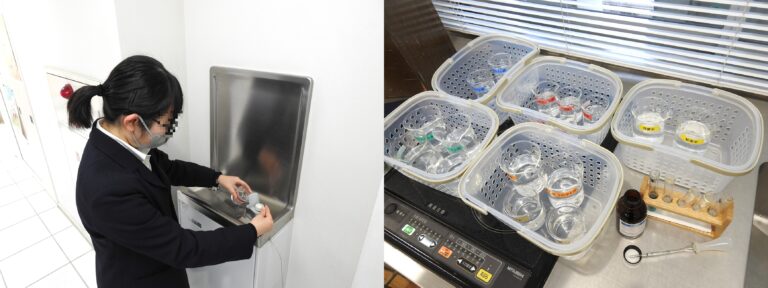 2月16日(金)の朝、保健委員会の生徒が水質検査のため、飲料用水のサンプルを採取しました。校内のさまざまな場所から集められたサンプルは、学校薬剤師の方に安心して飲める水だと確認していただきました。