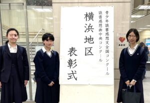 本校では高校生が横浜市長賞(1名)、毎日新聞社横浜支局長賞(1名)、優良賞(3名)を受賞し、学校賞もいただきました。表彰式に参加した3名は緊張の面持ちで、けれども誇らしげに賞状を受け取りました。