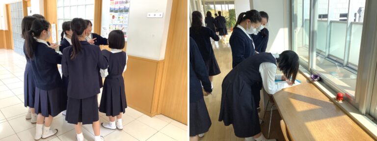他の学年が授業をしているので、話さずに静かに、グループごとに探索開始。時々廊下でまごまごしていると、通りかかった教員が「どこを探しているの?」と聞いてくれるのが嬉しいお助け。ソファーが並ぶ生徒ホールや図書館前のロビー、高3自習スペースにあるマスコット「オクトパス」、卒業記念樹、体育館へ向かう途中の自動販売機、落とし物コーナーなどなど20以上の校内の場所を歩いて回りました。