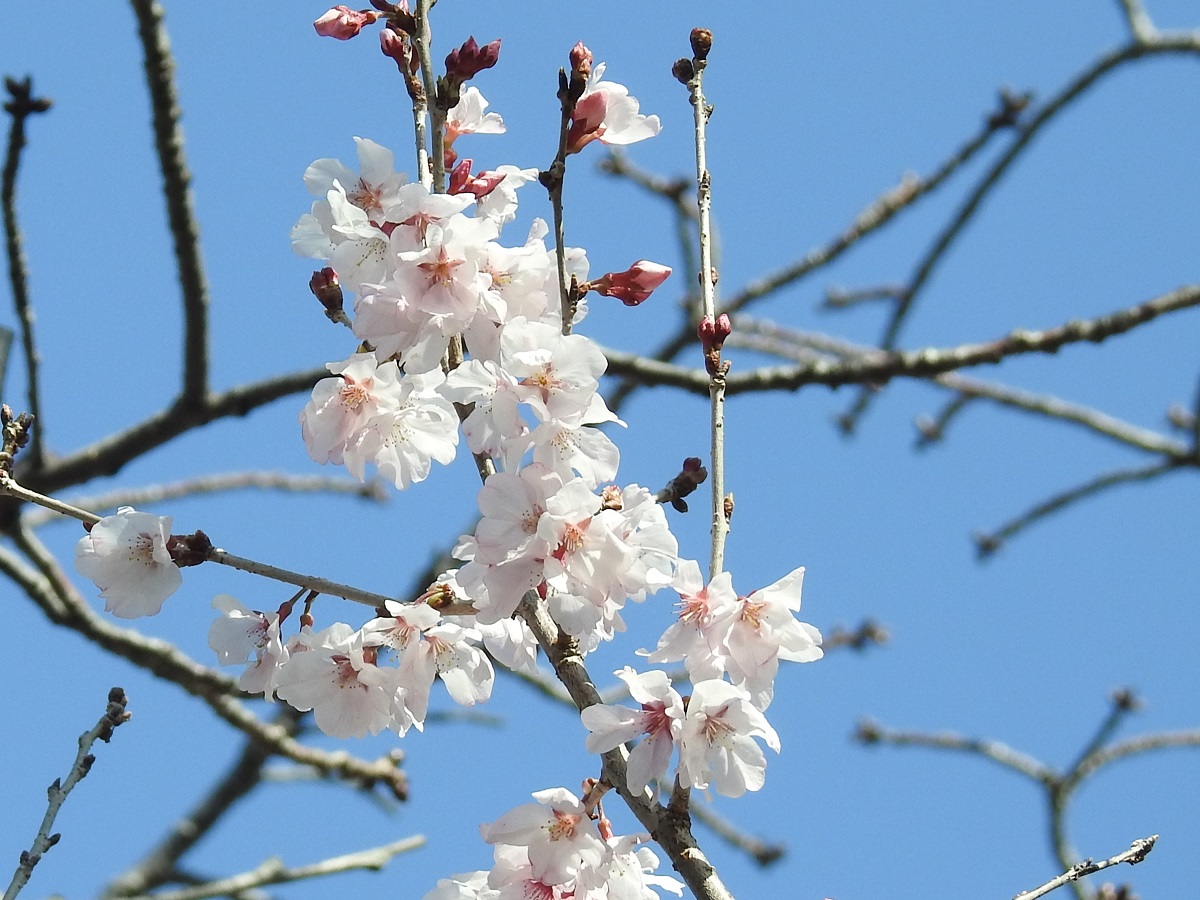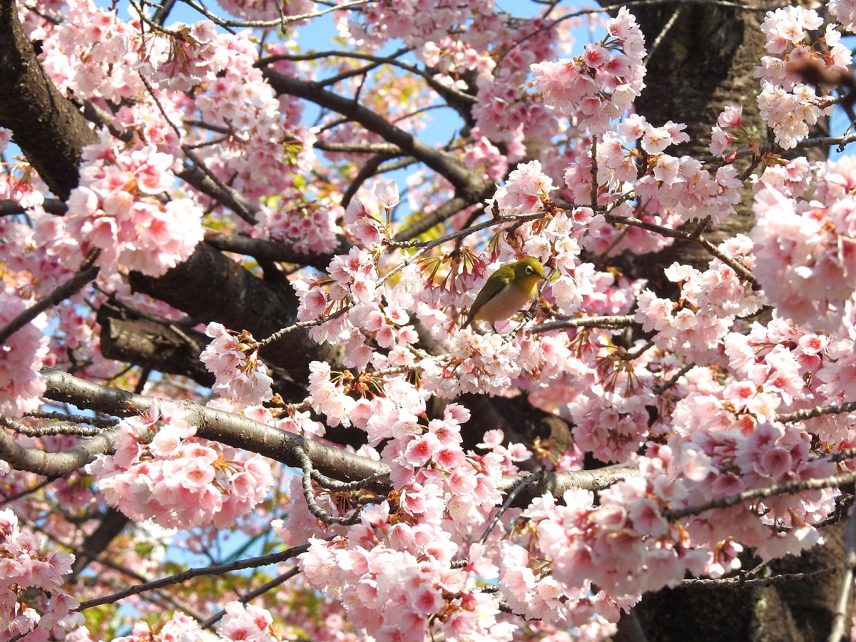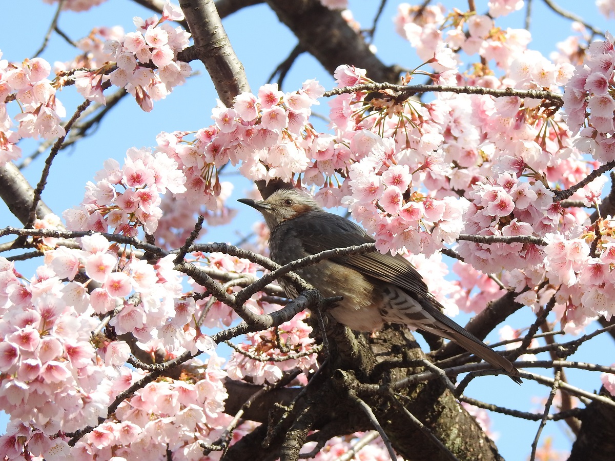 寒桜が満開です。ヒヨドリとメジロが花から花へと飛び回っています。