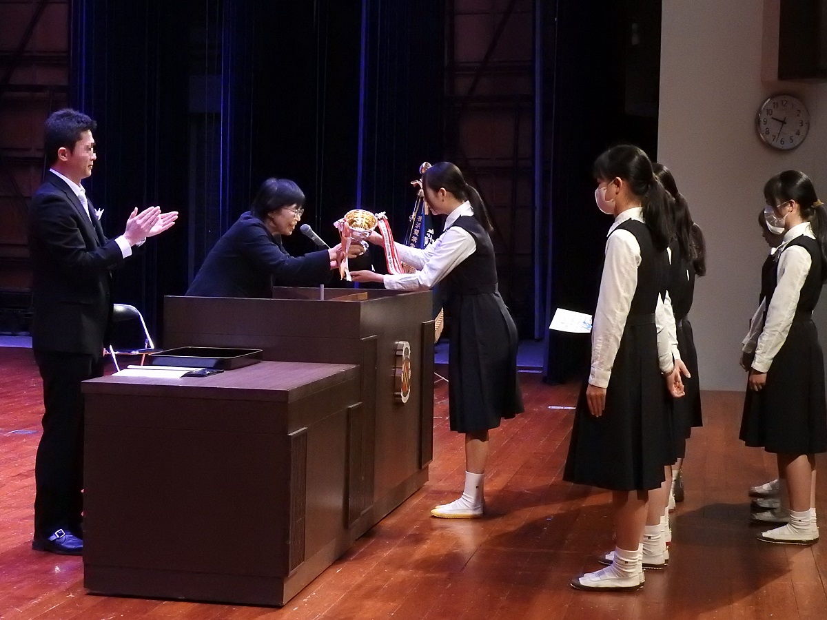 終業式では、表彰が行われました。各クラブやコンクールで入賞した生徒に賞状やトロフィーが授与され、活躍を称えました。