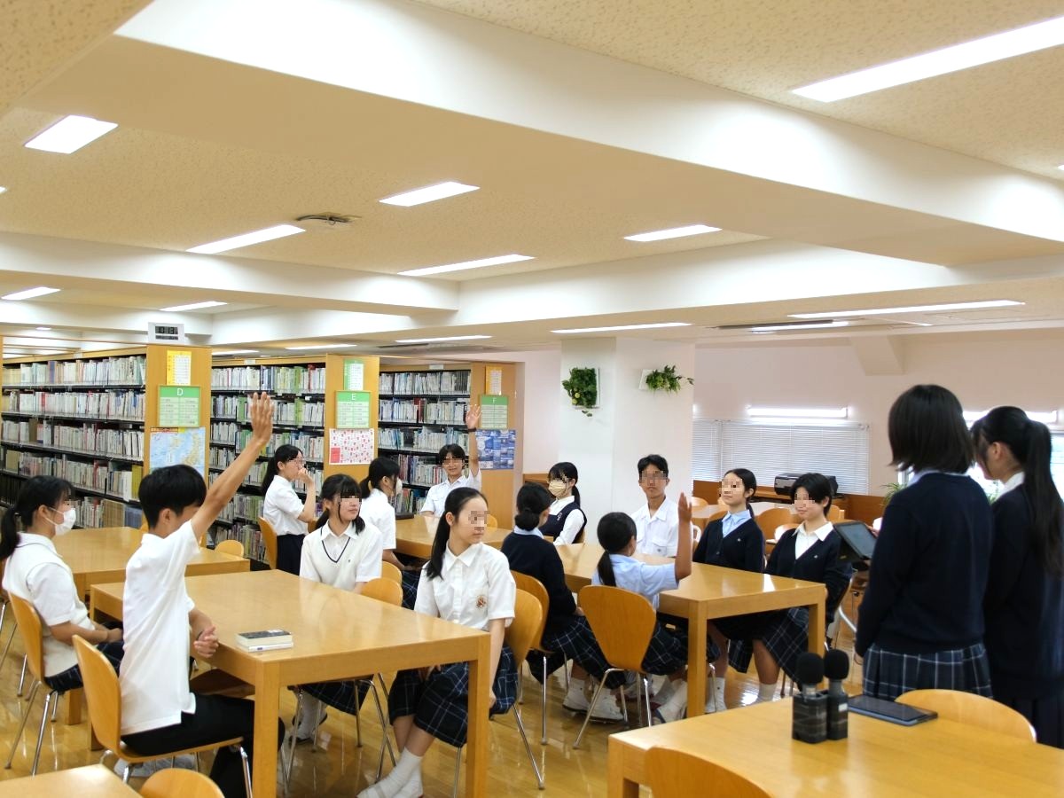 簡単な学校クイズの後は、委員会活動や本(読書)に関係する話題で意見交換。お互いに準備してきた本にまつわるクイズや、本探し大会でも盛り上がりました。「本」という共通のキーワードを通して話もはずみ、楽しい時間を過ごしました。