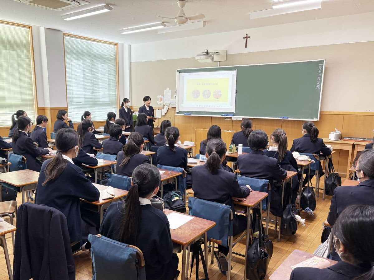 進路が決定した高3が、中1のLHRにて、自身の勉強方法や部活での経験談など、アドバイスを交えて話をしてくれました。中1の生徒達は、憧れの先輩の話に耳を傾けながら、自分の手帳に熱心にメモをとる様子が見られました。